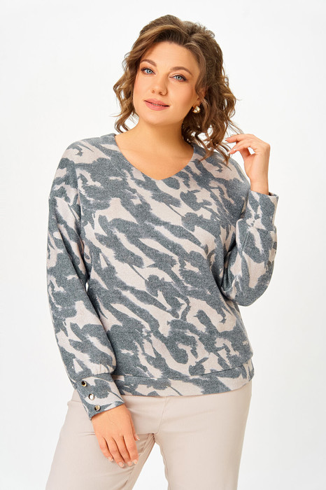 Джемпер из мягкого вискозного трикотажного полотна с люрексовой нитью, свободного силуэта со спущенной линией плеча. Горловина мягкой V-образной формы, рукав длинный, по низу присобран на манжеты из основной ткани, которые украшены тремя декоративными пуговицами. Низ джемпера оформлен притачной планкой из основной ткани.