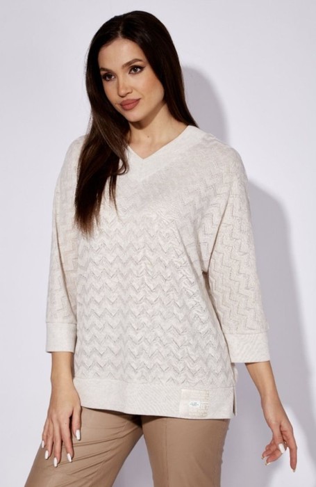 Джемпер женский, прямого силуэта, с цельнокройным рукавом длинной 3/4. По низу рукава притачная манжета. Вырез горловины У-образной формы. По низу притачные планки, с разрезами по бокам. Спереди, на планке декоративная нашивка. Спинка со средним швом и пришивным декором.