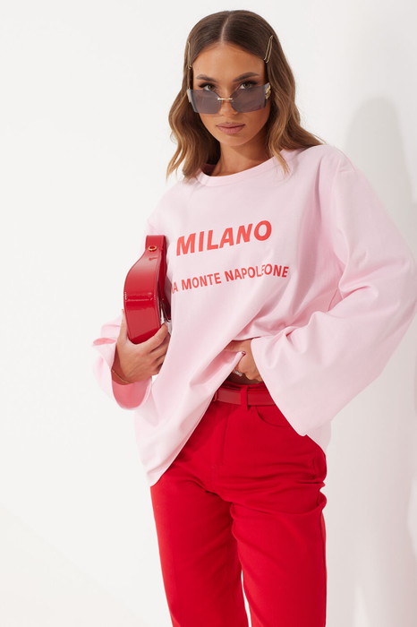 Джемпер свободной формы из трикотажного полотна. Горловина круглой формы. Рукав прямой свободный. На переде выполнена печать.