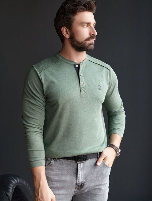 Джемпер хенли цвета хаки из полотна пике, состоящий из двух оттенков нити, создающем эффект меланж. Мягкая и дышащая ткань обеспечивает комфорт в течение всего дня, позволяя коже дышать и поддерживать оптимальную воздухопроницаемость. Материал тянется, обеспечивает долговечность и сохраняет презентабельный внешний вид даже после многократных стирок.