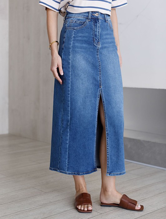Джинсовая юбка миди с разрезом из эластичного денима