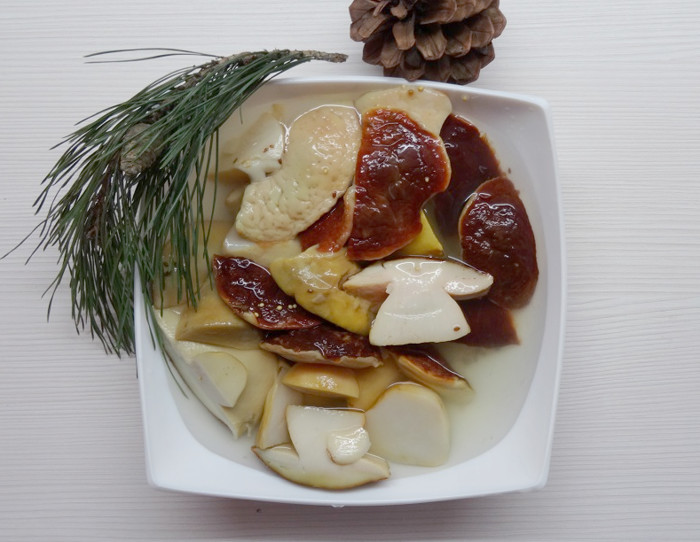 Состав: грибы, очищенная вода из артезианской скважины, соль, перец душистый, чеснок, семена горчицы, укроп, лимонная кислота, перец стручковый.