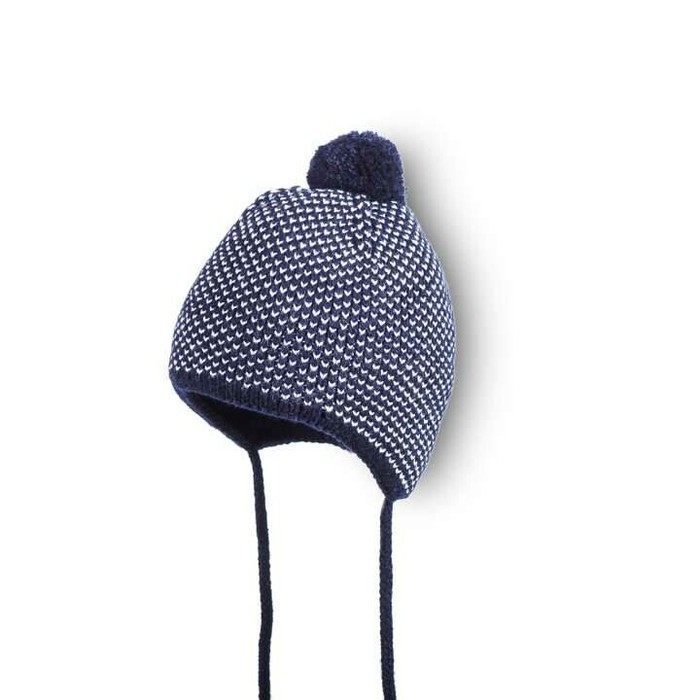 Шапка детская с цельновывязанными наушниками, на подкладке. со стянутым верхом и прессовым переплетением со сменой цвета, помпоном и шнуром.
