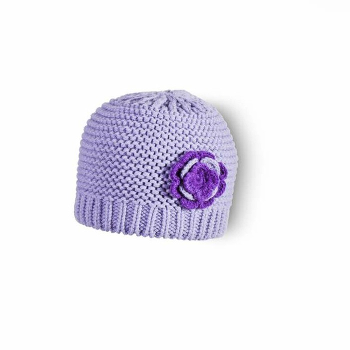 Шапка детская трикотажная без отворота, со стянутым верхом, однотонная, с крупным объемным переплетением чередованием лицевых и изнаночных петель, с отделочной деталью сбоку в виде цветка.