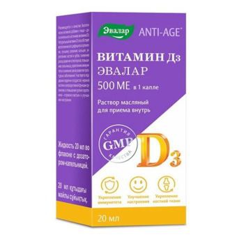Витамин D3 500 МЕ от Эвалар - это самая популярная форма витамина D3. Витамин D3 500 МЕ Эвалар способствует:- Укреплению иммунитета и снижению риска развития простудных заболеваний;- Восполнению дефицита витамина D в организме;- Лучшему усвоению кальция;- Укреплению костей, зубов, снижению риска развития остеопороза;- Повышению силы мышц;- Поддержанию сердечно-сосудистой, нервной систем и репродуктивной функции организма;- Повышению уровня серотонина гормона счастья.Преимущества масляного раствора витамина D3:- Физиологичная для организма жирорастворимая форма витамина D3;- Удобное дозирование (флакон с дозатором-капельницей);- Экономный расход препарата (20 000 МЕ в 1 мл);- Высокое усвоение за счет масляной формы;- Нейтральный вкус и запах, хорошо воспринимается как детьми6,так и взрослыми;- Не содержит аллергенных компонентов и спирта;- Сырье высокого качества.