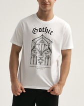 Фуфайка с коротким рукавом среднего объема, с оригинальным принтом, круглым вырезом горловины, которая оформлена обтачкой из рибаны.