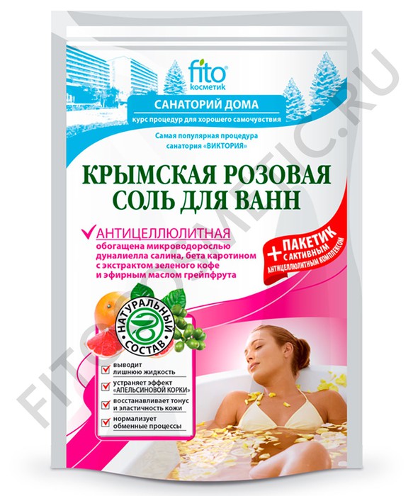 Крымская розовая соль, насыщенная уникальной микроводорослью дуналиелла салина, в сочетании со специальным активным антицеллюлитным комплексом на основе зеленого кофе и эфирного масла грейпфрута буквально творит чудеса! Ускоряет обменные процессы, выводит токсины и лишнюю жидкость, активизирует кровообращение, полностью устраняет эффект «апельсиновой корки», укрепляет и подтягивает кожу. Курс из 10-12 процедур «стирает» все признаки целлюлита, Ваша кожа снова упругая, эластичная и подтянутая, как после полноценного курса санаторных процедур.