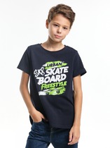 Футболка для девочки из трикотажного полотна "кармеланж" с приспущенным плечом, втачными короткими рукавами, горловиной овальной формы, обработанной втачной планкой и принтом на полочке, выполненным в технике шелкографии. По шву втачивания планки в горловину настрочена отделочная строчка.