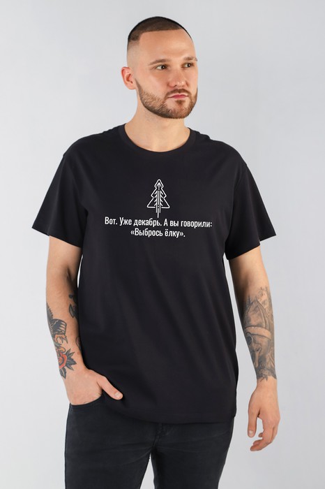 Футболка мужская с короткими рукавами, удлиненными плечевыми швами, горловиной овальной формы, обработанной втачной планкой и принтом на детали переда, выполненным в технике шелкографии. По шву втачивания планки в горловину настрочена отделочная строчка. Нижние срезы руквов и изделия обработаны швом вподгибку.