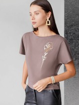 Футболка прямого свободного кроя, выполнена из хлопкового полотна. Характеристики: прямой свободный крой, горловина овальная, рукав слегка спущен, горловина и край рукава выполнены из довяза, по передней части изделия слева декоративная объемная печать "Annete". Длина по центру спинки 69 см, длина рукава 18 см.