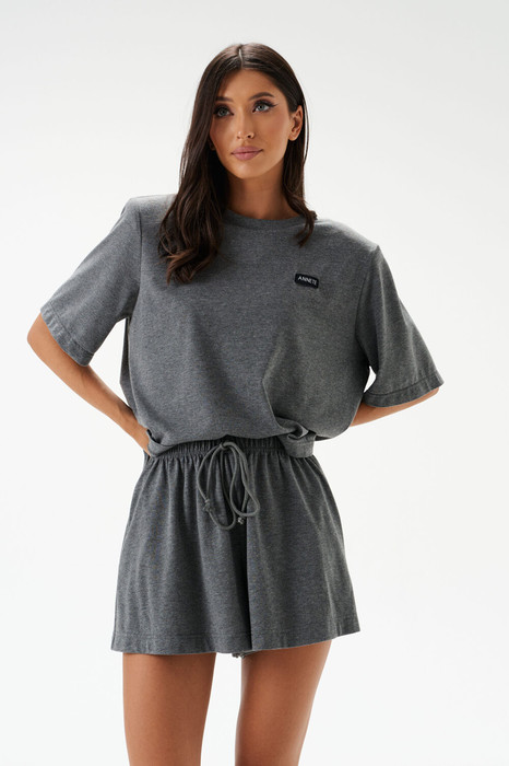 Футболка прямого свободного кроя с акцентными плечами выполнен из хлопкового полотна серого цвета.Характеристики: прямой крой, подплечники (съёмные), овальный вырез горловины, по переду брендированная нашивка, рукав втачной. Длина спинки 51 см, длина рукава 28 см.