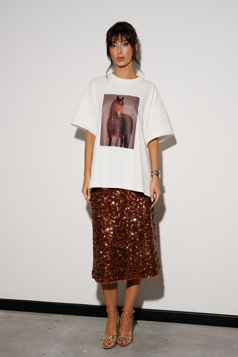 Футболка прямого свободного кроя, выполнена из трикотажного полотна молочного цвета. Характеристика: прямой крой, овальная горловина. Рукав спущен. Спинка цельнокраеная, по переду напечатан принт. Длина спинки 68см, длина рукава от края горловины 41см.