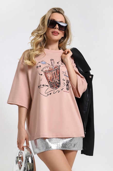 Футболка молодежная из гладкокрашеного свободного покроя оверсайз, с короткими втачными рукавами, спущенной линией плеча, горловиной овальной формы, обработанной широкой втачной планкой, и принтом на полочке, выполненным в технике «шелкографии».