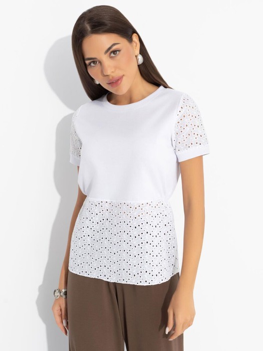 Bonjour, леди. Отправляетесь в путешествие своей мечты? Возьмите с собой футболку CHARUTTI. Она станет шикарным дуэтом и с шортами, и с юбками в пол, и с льняными брюками. К тому же, приятно оттенит золотистый оттенок вашей кожи. Футболка акцентного кроя. Линия талии выделена деликатными сборками по бокам изделия. Комбинация двух видов материала.
