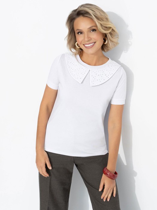 Если бы героиня романа Джейн Остин жила в наше время, она точно выбрала бы эту футболку. Нежная, с характером и чувством стиля – прямо как вы. Добавьте улыбку и изящные украшения – идеальный образ гарантирован! Футболка из мягкого трикотажа с короткими рукавами и объёмным ажурным воротником. Подходит для офиса, прогулок и тёплых свиданий с книгой за чашкой кофе.