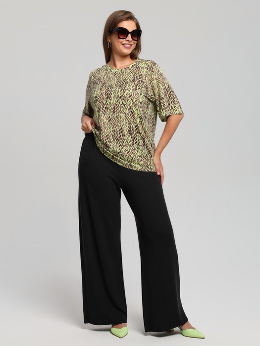 Футболка женская из вискозного трикотажного полотна с набивным рисунком, классического покроя, с горловиной овальной формы, обработанной широкой втачной планкой, с короткими втачными рукавами.