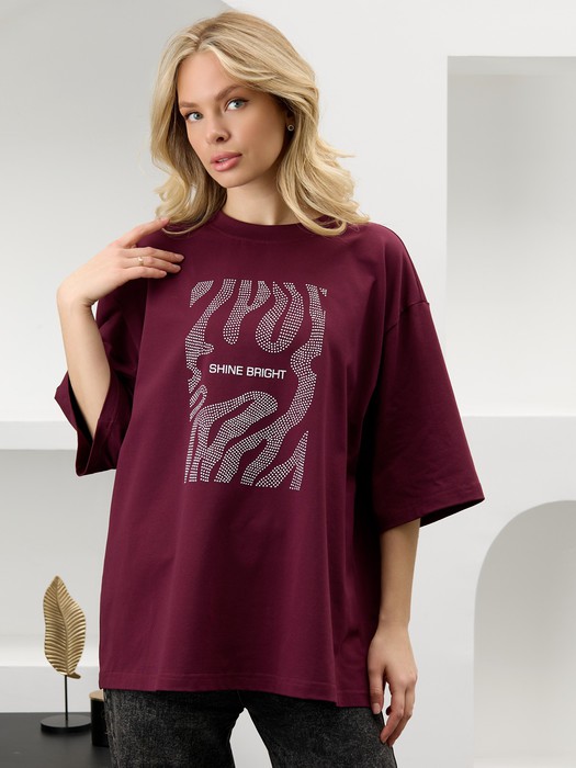 Футболка молодежная из гладкокрашенного трикотажного полотна «кулирка» с лайкрой, свободная покроя «оверсайз», с горловиной овальной формы, обработанной притачной планкой, рукавами длиной до локтя. На полочке выполнена печать в технике «шелкографии».