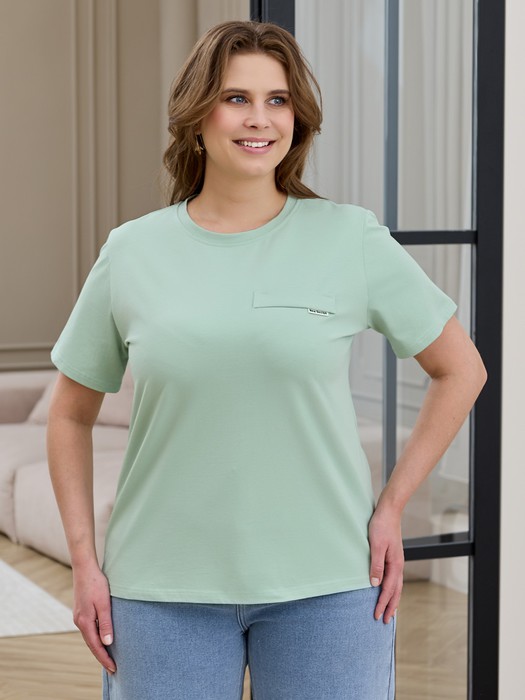 Футболка женская из гладкокрашеного трикотажного полотна «кулирка с лайкрой», прямого кроя, с короткими втачными рукавами, горловиной овальной формы, обработанной втачной планкой. На полочке настрочена планка имитирующая вход в карман с декоративной нашивкой.
