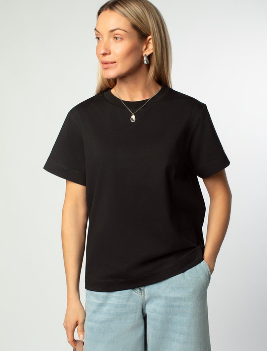 Состав: 92%Хлопок 8%ПУ Параметры модели на первом фото: Рост 170, бюст 89, талия 63, бедра 92Футболка выполнена из премиального хлопка. Базовая модель, которая хорошо будет сочетаться в гардеробе с любым низом и любым дополнительным верхом вне зависимости сезона. Эластан в составе способствует формоустойчивости и меньшей сминаемости. Изделие украшено логотипом бренда.