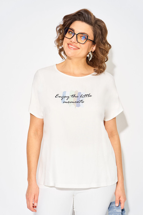 Лаконичная женская футболка, по типу топа с цельнокроеным коротким рукавом. Модель полупримталенного силуэта с нагрудными выточками и разрезами по бокам. Вырез горловины округлый, окантован. По лифу размещена термо-печать.