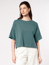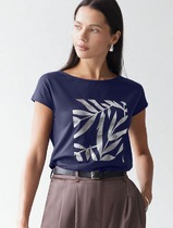 Футболка женская из трикотажного полотна «кулирка» с набивным рисунком, свободного покроя, со спущенным плечом и втачными рукавами длиной до локтя, горловиной овальной формы, обработанной притачной бейкой, в нижней части боковых швов – разрезы.
