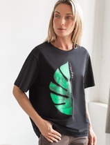 Футболка женская из гладкокрашенного трикотажного полотна «кулирка с лайкрой», свободного покроя, со спущенным плечом и втачными рукавами длиной до локтя, горловиной овальной формы, обработанной втачной планкой. По центру полочки выполнена вышивка «пайетками» в тон изделия. В нижней части боковых швов небольшие разрезы.