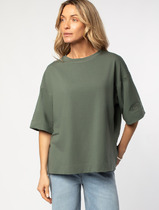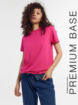 Футболка женская из г/к вискозного полотна со спущенным плечом. Проймы обработаны узкой притачной планкой, горловина - узкой бейкой из основной ткани.