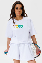 Футболка из гладкокрашеного трикотажного полотна «кулирка» с эффектом «варенки», свободного покроя, горловиной овальной формы, обработанной притачной планкой. Низ рукавов и изделия состоит из двух частей, одна из которых с необработанным краем, другая с подгибкой и соединенных между собой накладным швом.