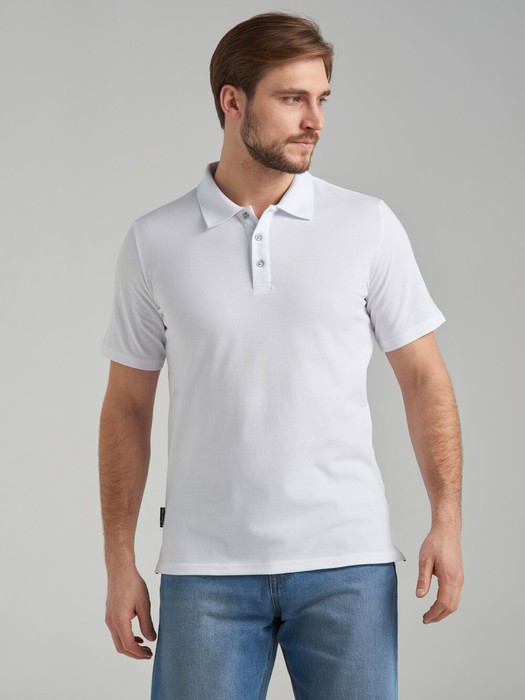 Футболка-поло из хлопкового полотна "пике". Классическая модель поло с короткими рукавами. Воротник выполнен из трикотажной рибаны в цвета основного полотна. Низ рукава со свободным краем в подгибку. На полочке застежка-планка на пуговицах. По низу поло настрочен жаккардовая этикетка с фирменным логотипом. По низу футболки в боковых швах выполнены разрезы, обработанные тесьмой.