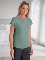 Футболка молодежная из гладкокрашенного полотна «кулирка с лайкрой», свободного покроя, со спущенной линией плеча, втачными рукавами длиной до локтя, горловиной овальной формы, обработанной втачной планкой. Изделие дополнено декоративной нашивкой, в боковых швах выполнены разрезы.