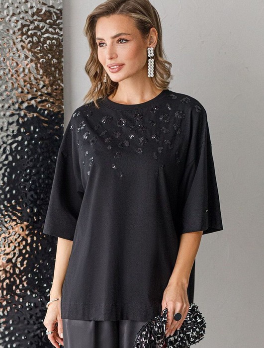 Оверсайз футболка черного цвета из премиального хлопка с добавлением эластана создана для комфорта и стиля каждый день. Натуральный материал приятный к телу, дышащая ткань хорошо держит форму и подходит для повседневной носки дома, в офисе или на прогулке. Классический свободный крой, удлиненный прямой силуэт и свободная посадка делают эту базовую футболку универсальным решением для любой фигуры и роста, включая плюс сайз размеры и беременных девушек, отлично скроет животик. Широкие рукава держат форму и подойдут на полные руки. Нарядная футболка украшена авторским принтом пайетками. Такой акцент делает модель уместной как для особых случаев, так и для ежедневных образов.
