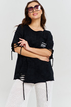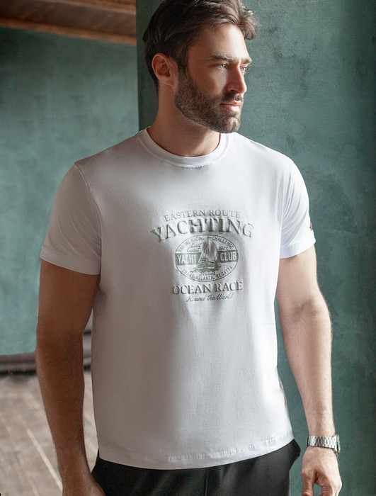 Футболка выполнена из премиального хлопка с эластаном. Авторский принт нанесен фактурными красками с устойчивым покрытием. Изделие комфортно сидит по фигуре, не сковывая движений. За счет среднего объема, хорошо подойдет как первый слой под пиджак, кардиган или бомбер. На рукаве нашивка из эко-кожи с логотипом бренда.
