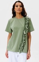 Футболка женская из гладкокрашенного трикотажного полотна «кулирка», свободного силуэта, с боковыми швами, переходящими в рельефы, в правом соединительном шве выполнен разрез. Горловина овальной формы обработана втачной планкой и дополнена декоративным элементом.