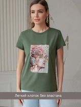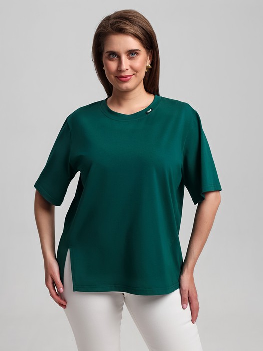 Футболка женская из гладкокрашенного трикотажного полотна «кулирка», свободного силуэта, с боковыми швами, переходящими в рельефы, в правом соединительном шве выполнен разрез. Горловина овальной формы обработана втачной планкой и дополнена декоративным элементом.