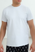 Мужская футболка из кулирки с лайкрой. Короткие рукава с геометрическими узорами, принт в виде небольшой надписи, округлая горловина. Четыре расцветки — белая, коралловая, меланж и индиго. Размеры от 46 до 54. Есть розница.