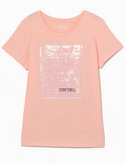 Футболка слегка полуприлегающего силуэта длиной до бедер. Короткий рукав. Круглая горловина обработана узкой притачной обтачкой из основного полотна. По горловине отстрочка. По ростку проложен усилитель из экстрафорной ленты. С изнаночной стороны спинки выполнена печать-размерник. На полочке выполнена шелкография и вышивка прозрачными пайетками.