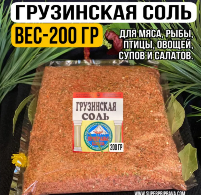 «ГРУЗИНСКАЯ СОЛЬ» является универсальной приправой. Ее Можно добавлять по вкусу в любые мясные блюда, подливки, фарш, сациви, харчо, маринад для шашлыка, лобио, чахохбили и другие блюда.