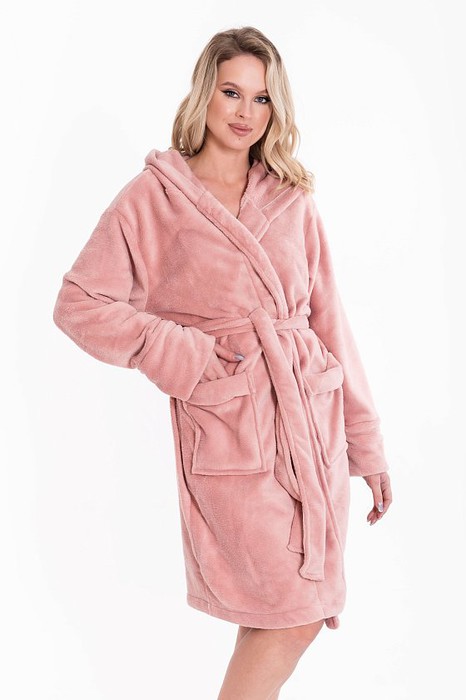 Женский халат из велсофта на запах с поясом, с капюшоном и карманами спереди. Длинные рукава на манжетах. Идеальный вариант для дома в прохладные дни.