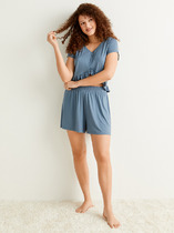 Халат женский с втачным коротким рукавом, застёжка на петли-пуговицы.