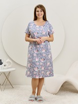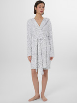 Халат женский из гладкокрашенного трикотажно полотна «кулирка» с набивным рисунком, полуприталенного силуэта, с короткими рукавами покроя «реглан» и горловиной овальной формы, окантованной основным материалом, с центральной бортовой застежкой на тесьму «молния». По срезу горловины выполнены неглубокие складки, нижние резы рукавов обработаны притачными манжетами с кантом контрастного цвета.
