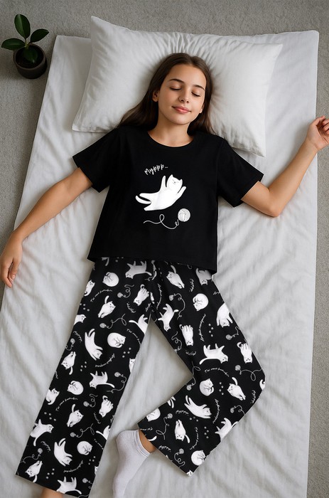 Детская пижама для девочки и девочки подростка — отличный выбор для сна и отдыха. Чёрная футболка со спущенным плечом украшена принтом Котик, а штаны дополнены атласным бантом на поясе и забавным рисунком.