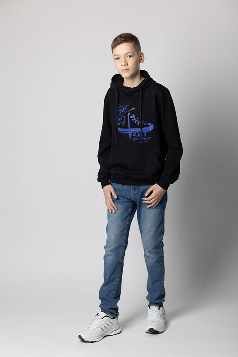 Мужское худи. Состав: Футер 2-х ниточный, 75% хлопок, 20%  полиэстер, 5%  лайкра. Особенности: Накладной карман-кенгуру; Капюшон со шнурком; Втачной рукав; Эластичный манжет по низу рукава и изделия. Таблица размеров и ростов Размер 36 38 40 42 44 Обхват груди, см 64-66 68-70 72-74 76-78 80-82 Рост, см 134-140 140-146 146-152 152-158 158-164