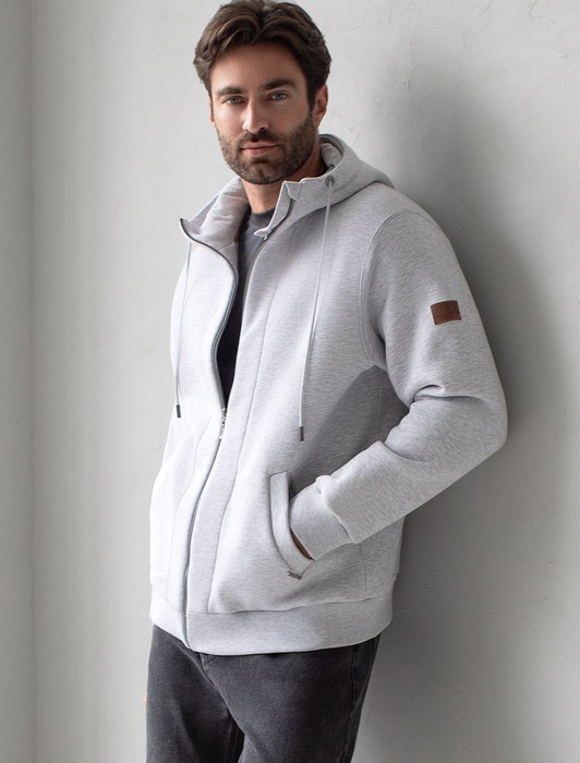 Состав: 80%Хлопок 20%ПЭ Плотность: 320 Г/м2Худи на молнии выполнено из премиального эластичного футера трехнитки с теплым начесом. Модель с капюшоном и воротом стойка дополнена боковыми карманами и нашивкой с логотипом бренда из эко-кожи. Ранней осенью или поздней весной можно носить в качестве верхней одежды. Высококачественная фурнитура цвета темное серебро. Изделие сочетается в костюме с брюками U44.006