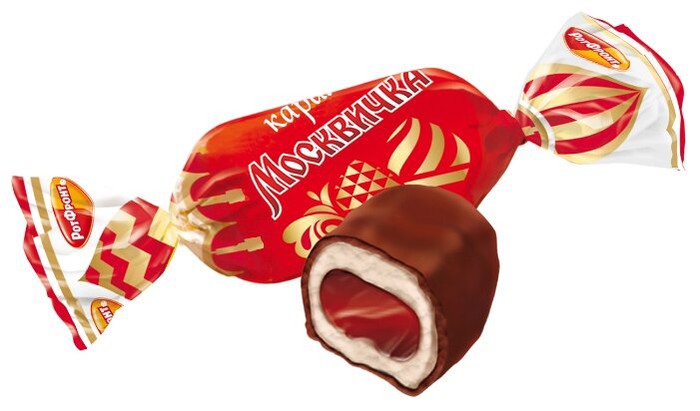 Легендарная конфета «Москвичка» фабрики «Рот Фронт» – это хрустящая белая карамель, покрытая шоколадной глазурью. Внутри конфеты – нежная помадная начинка с добавлением какао, сгущенного молока и терпким коньячным ароматом. Вкус, знакомый многим поколениям, сочетание твердой карамели и тающей мягкой начинки.