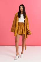 Кардиган прямого свободного кроя выполнен из струящейся ткани с контрастным ярким принтом. Характеристики: прямой свободный крой, рукав широкий цельнокроеный, в боковых швах разрезы, по линии талии нашиты шлевки, в комплекте пояс выполнен из ткани основного изделия. Длина по спинке 139 см, длина рукава от края горловины 70 см.