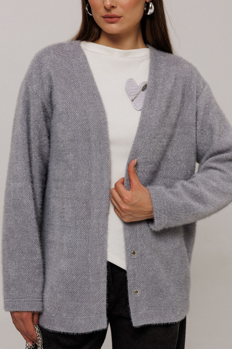 Кардиган из трикотажного полотна, свободного силуэта, слегка заужен к низу, со спущенной линией плеча и втачным рукавом. Полочка с V-образным вырезом и центральной застежкой на пришивные кнопки. Без подкладки.