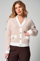 Кардиган женский из костюмной плюшевой ткани на подкладке. Рукава длинные спущенные, по низу притачная манжета из основной ткани. Центральная застежка на притачных широких планках застегивающихся на петли и пуговицы. Низ обработан притачным поясом.