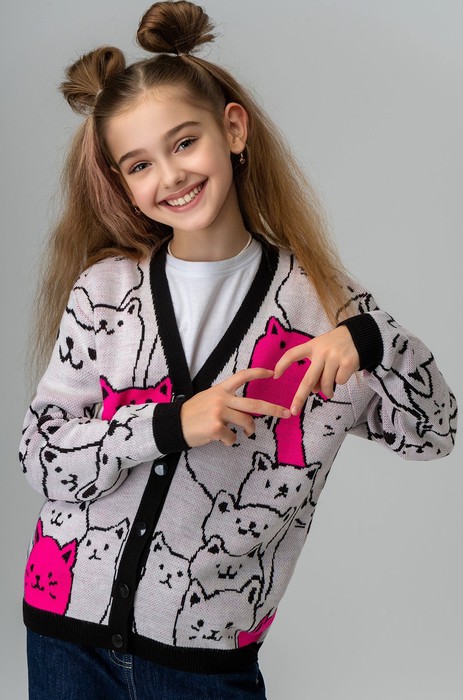 Подростковый кардиган имеет прямой крой и стильный V-вырез, что делает его универсальным вариантом. Длинные рукава дарят дополнительный уют, а застежка на пуговицы добавляет изящества. Забавные котики придают кофточке игривый характер и делают его особенно привлекательным для подростков.