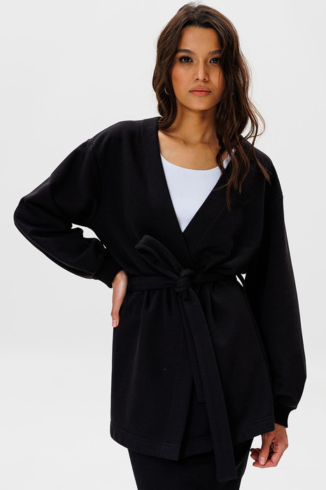 Жакет Gowear из футера в стиле smart casual поможет создать в меру строгий и одновременно расслабленный образ. Жакет составит беспроигрышную комбинацию с платьями, юбками и брюками. Жакет прямого силуэт, с v-образным вырезом горловины, без застежки, с отдельным поясом. На левом переде вышивка-логотип в цвет ткани. Рукав свободный, со складками, присобран на манжету. Жакет без подкладки.