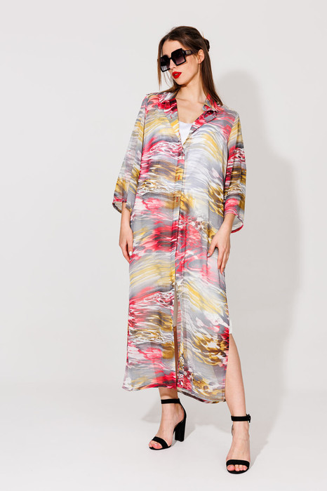 Кардиган прямого кроя с акцентным принтом. Горловина обработана рубашечным воротником с отрезной стойкой. Модель со слегка приспущенной линией плеча и рукавами длиной 7/8. Застёжка центральная на петли и пуговицы. По низу изделия разрезы.
